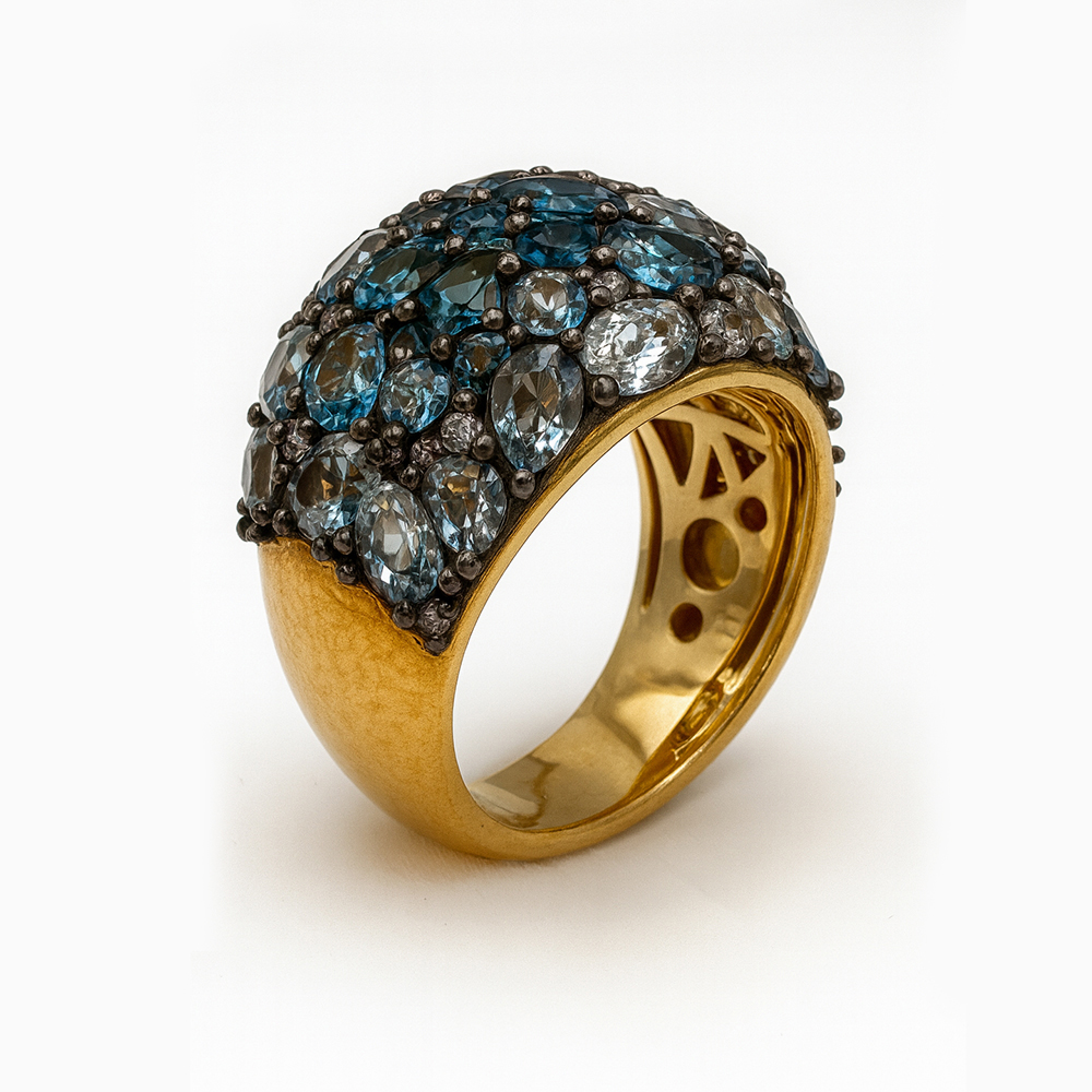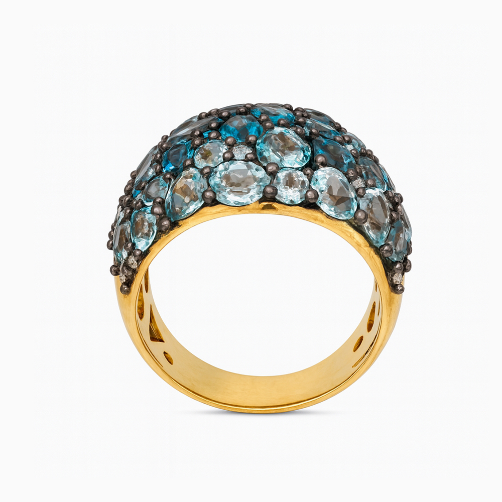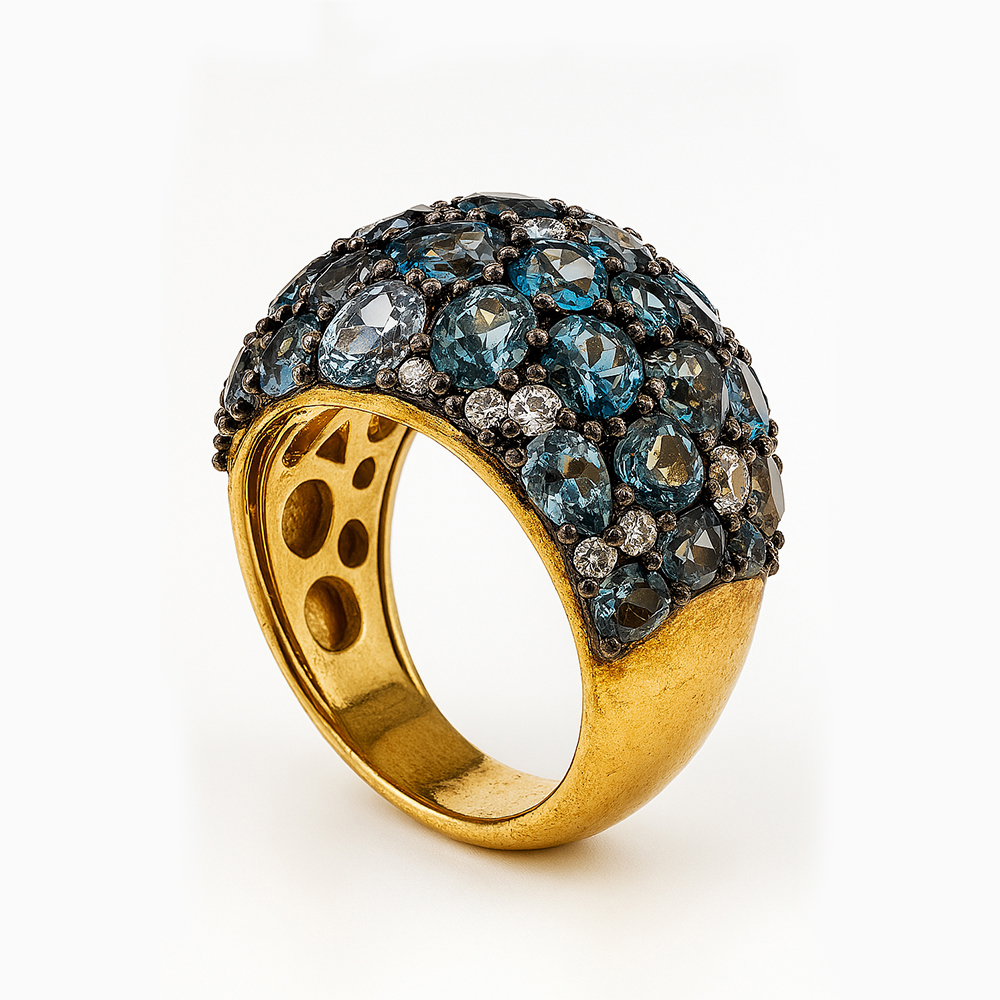 Anillo tipo cúpula elaborado en oro amarillo con una composición de topacios azules en distintos tonos engastados en superficie, acompañados por pequeños diamantes que aportan brillo y contraste. Su diseño volumétrico crea una pieza llamativa y sofisticada inspirada en la alta joyería.
