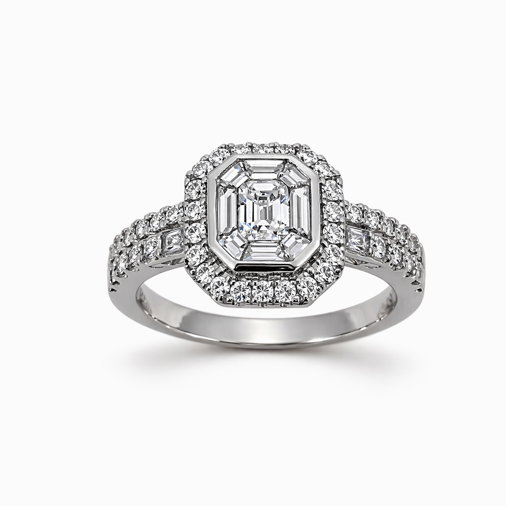 Anillo de diamante corte esmeralda con halo pavé en oro blanco