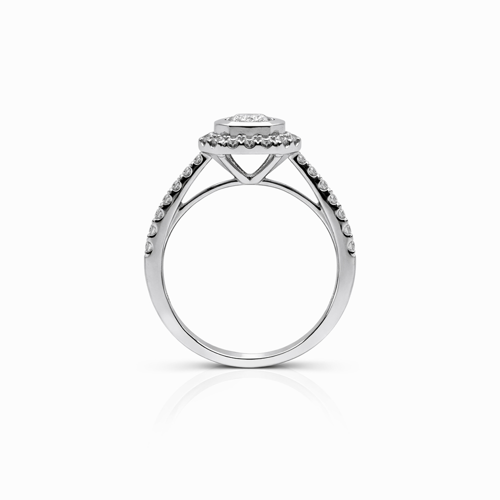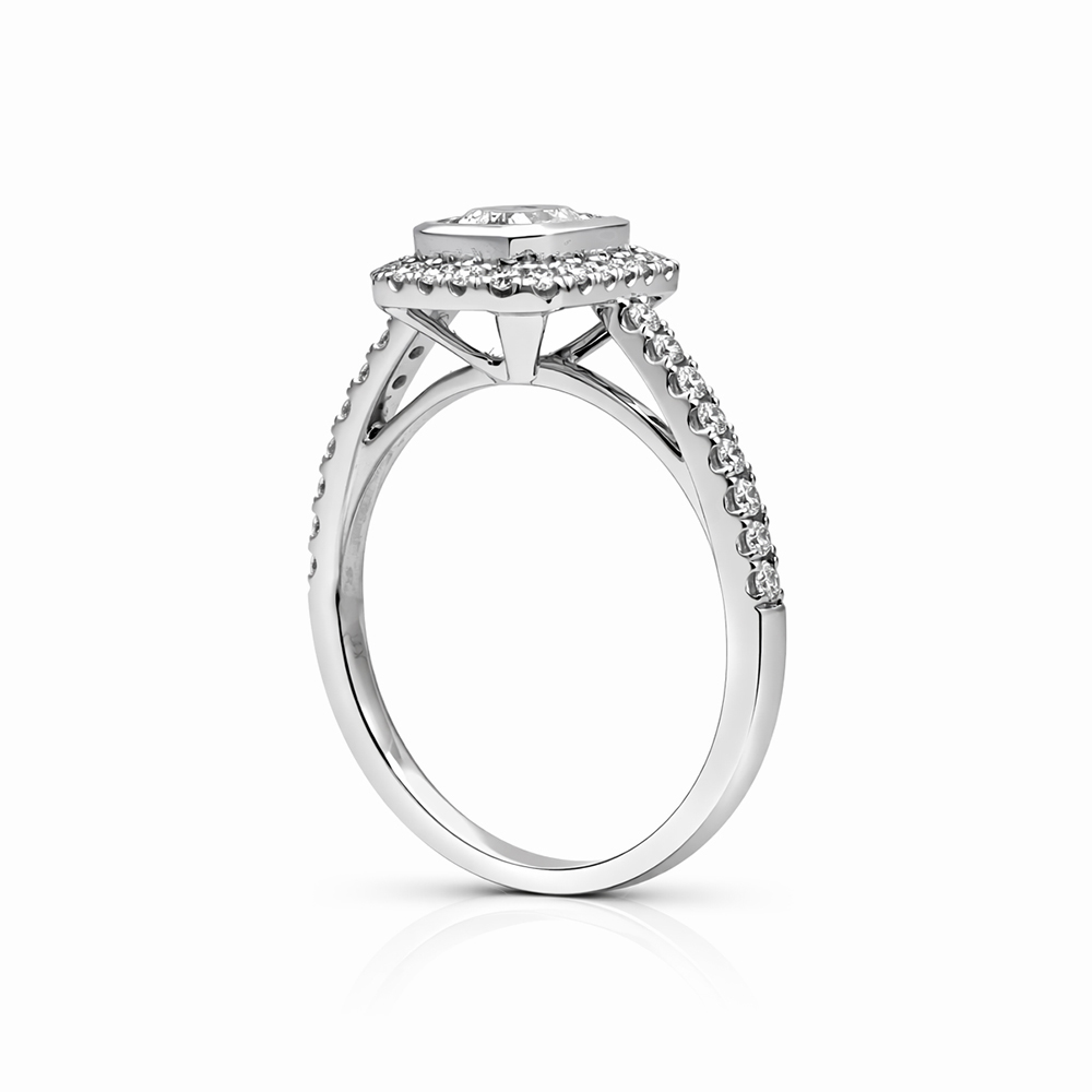 Anillo de oro blanco con diamante central corte esmeralda rodeado por un halo de diamantes pavé que realzan su brillo. El diseño incluye diamantes adicionales en los hombros de la banda, creando una pieza elegante y sofisticada ideal como anillo de compromiso o joya de alta gama.