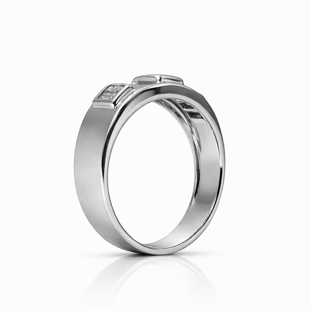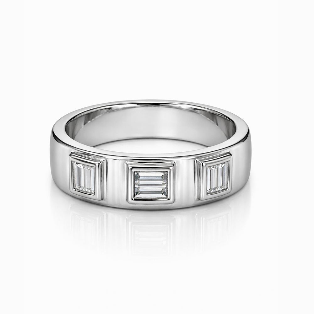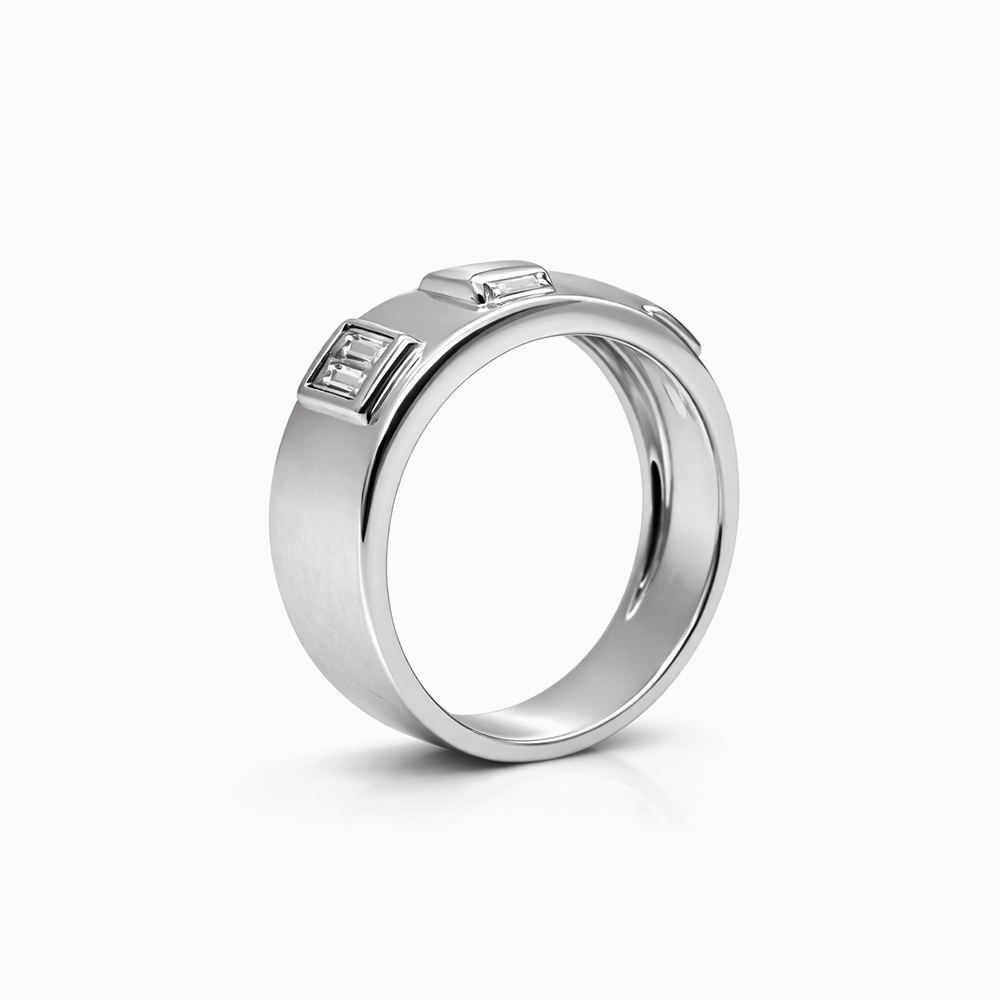 Anillo de diamantes en oro blanco con diseño de banda moderna que incorpora diamantes corte baguette engastados en bisel. Su estética minimalista y geométrica resalta la elegancia del corte baguette, ofreciendo una joya contemporánea ideal para uso diario o como anillo de estilo sofisticado.
