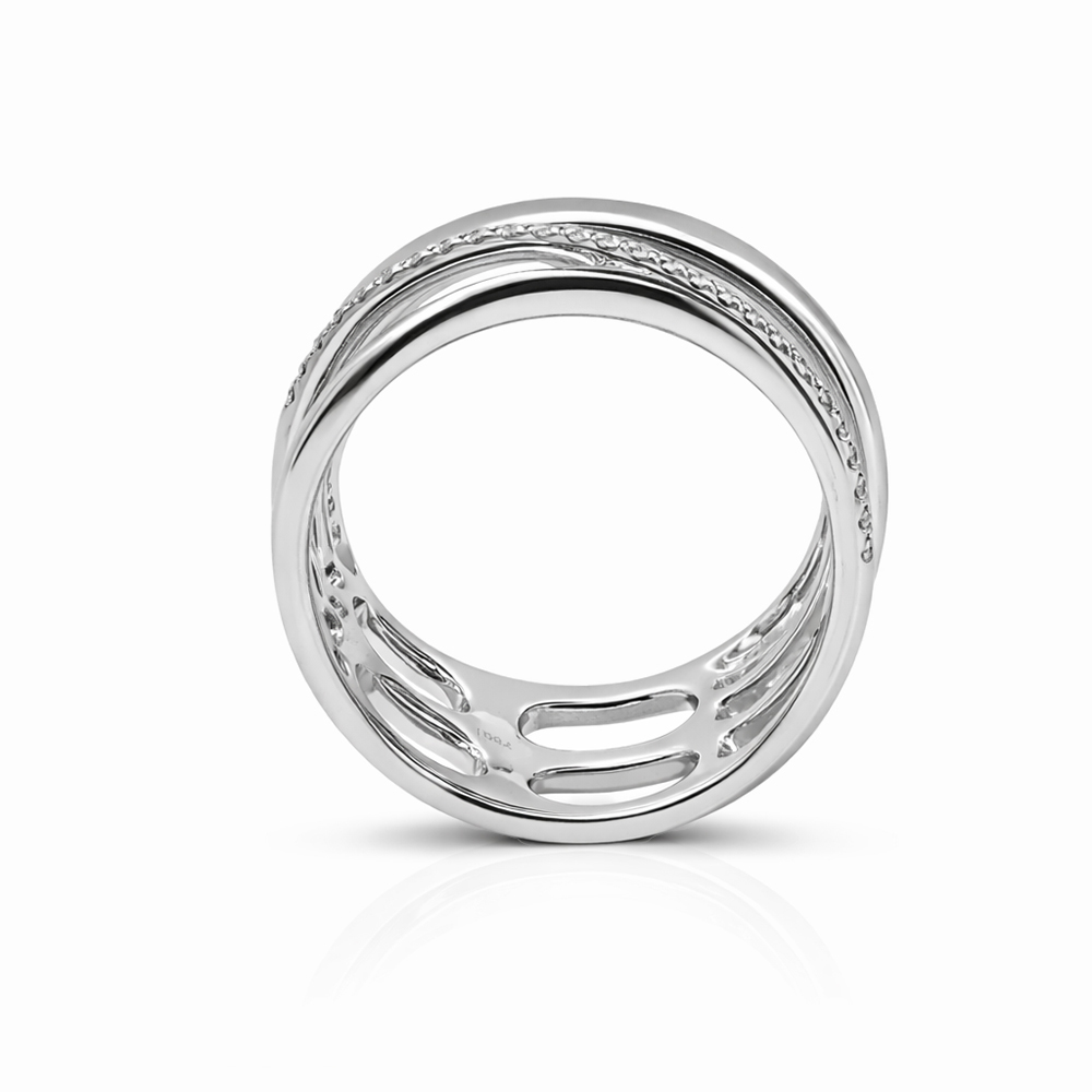 Anillo de oro blanco con diseño contemporáneo de múltiples bandas entrecruzadas. Combina superficies pulidas con delicadas líneas de diamantes pavé que crean un efecto dinámico y elegante. Su estructura abierta y moderna lo convierte en una pieza sofisticada ideal para uso diario o como joya de diseño.