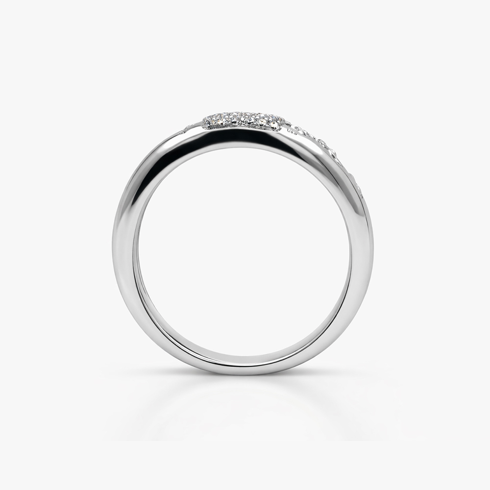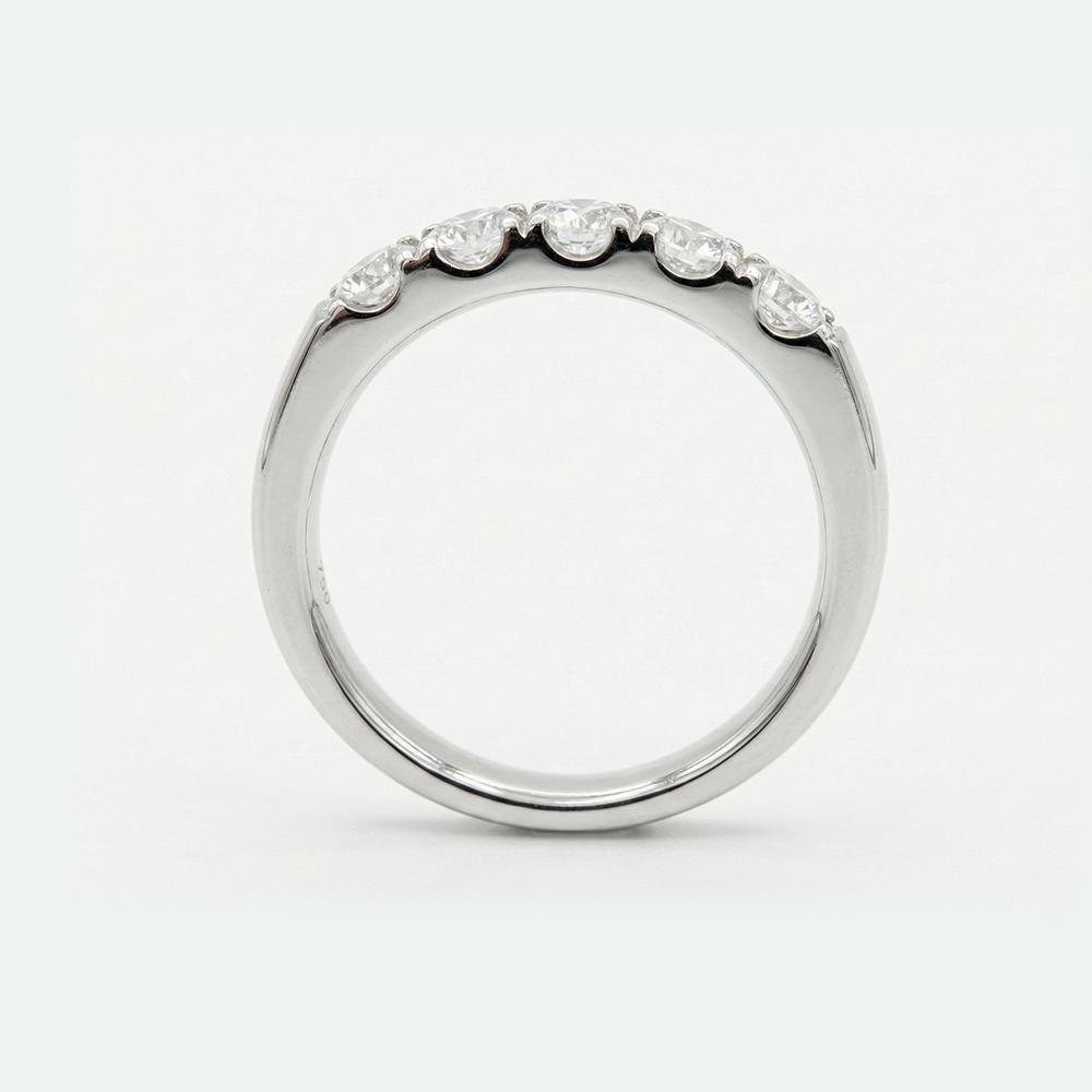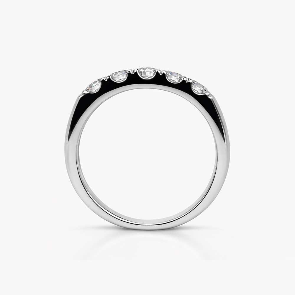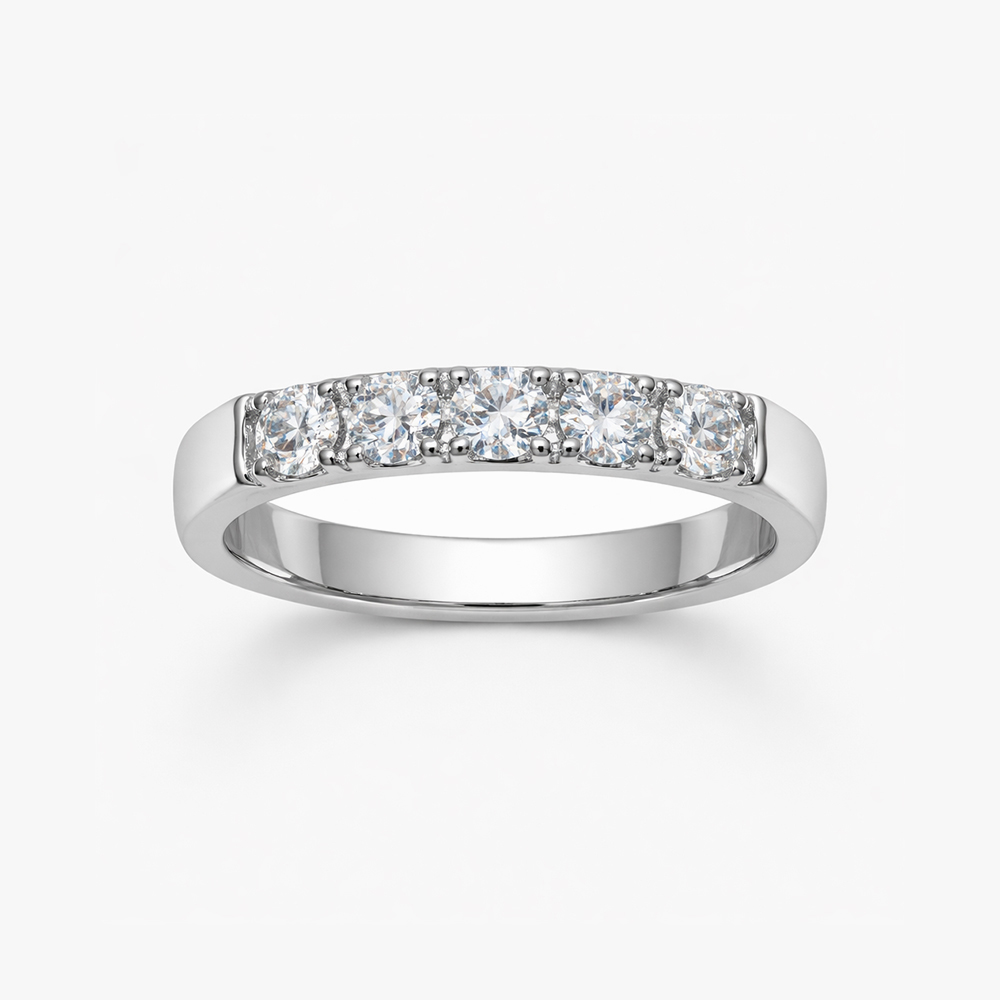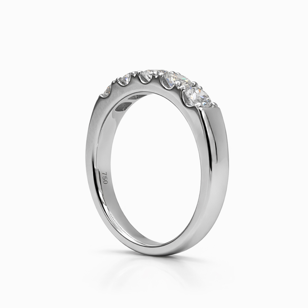 Anillo de diamantes en oro blanco estilo media alianza con engaste superior que resalta el brillo natural de cada diamante. Su diseño minimalista y elegante lo convierte en una joya ideal para compromisos, aniversarios o para quienes buscan un anillo fino y sofisticado con alto valor estético.