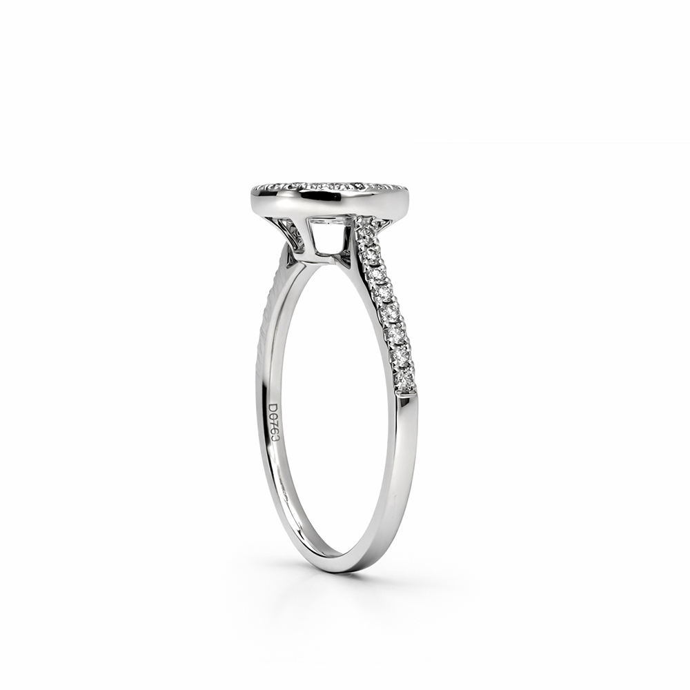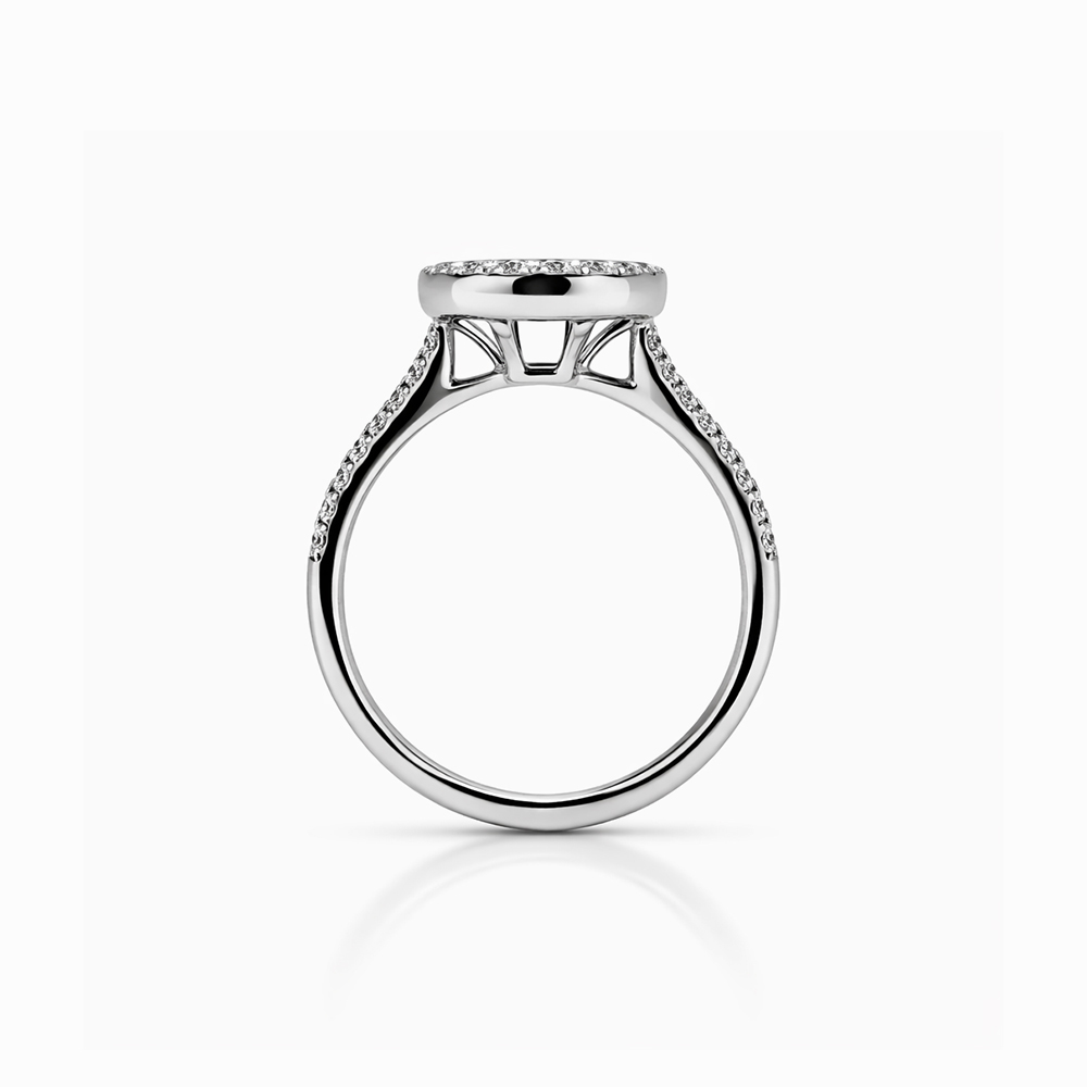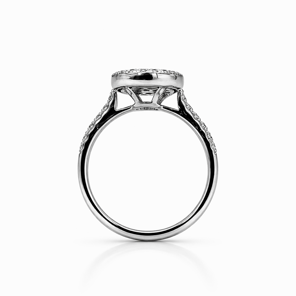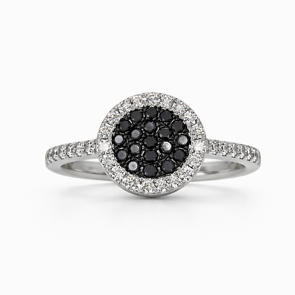 Anillo de oro blanco con diseño halo circular compuesto por diamantes negros en el centro y un halo exterior de diamantes blancos. Su estructura fina con pavé en el brazo del anillo aporta brillo adicional y un contraste elegante ideal para quienes buscan una joya moderna y sofisticada.