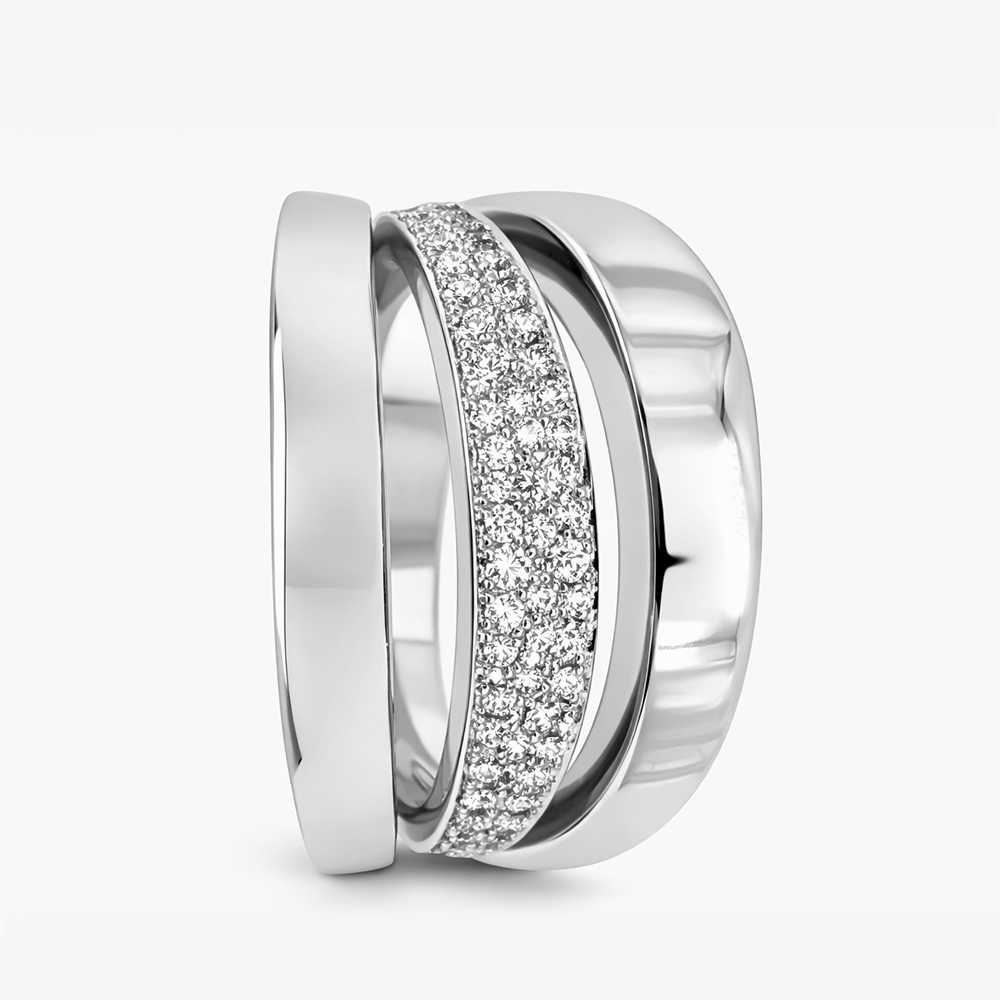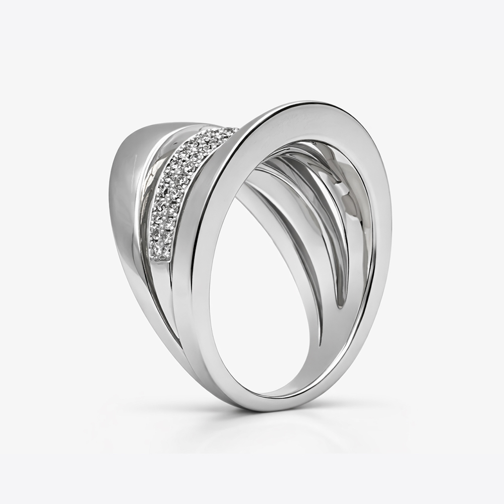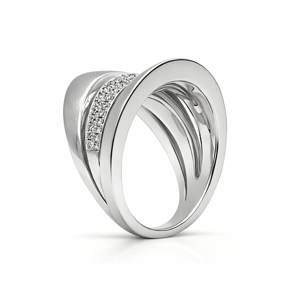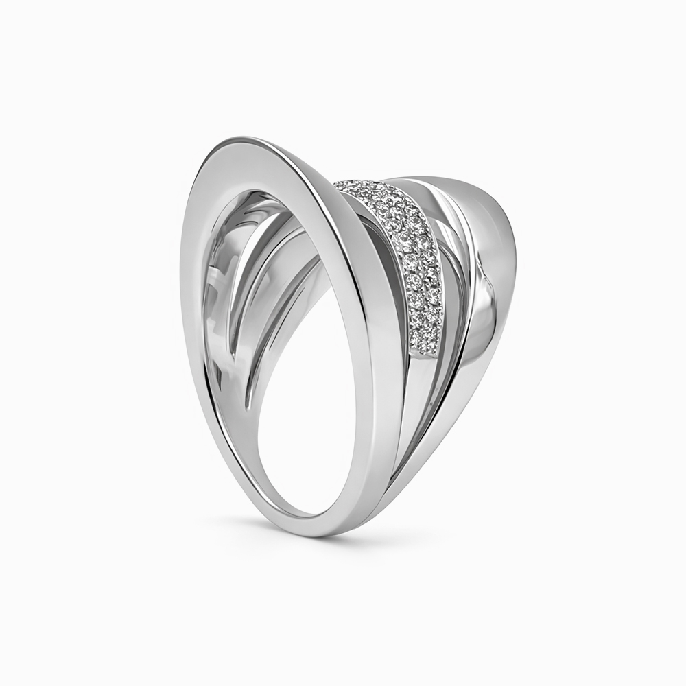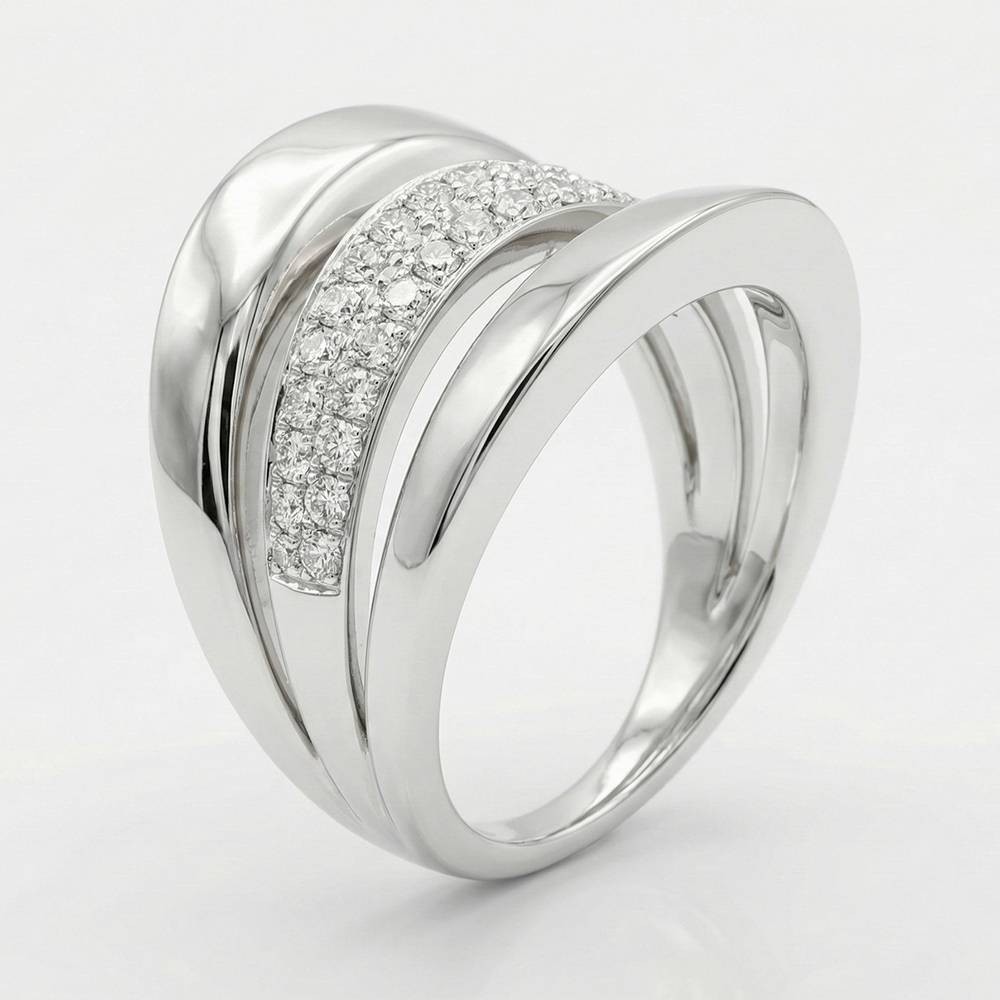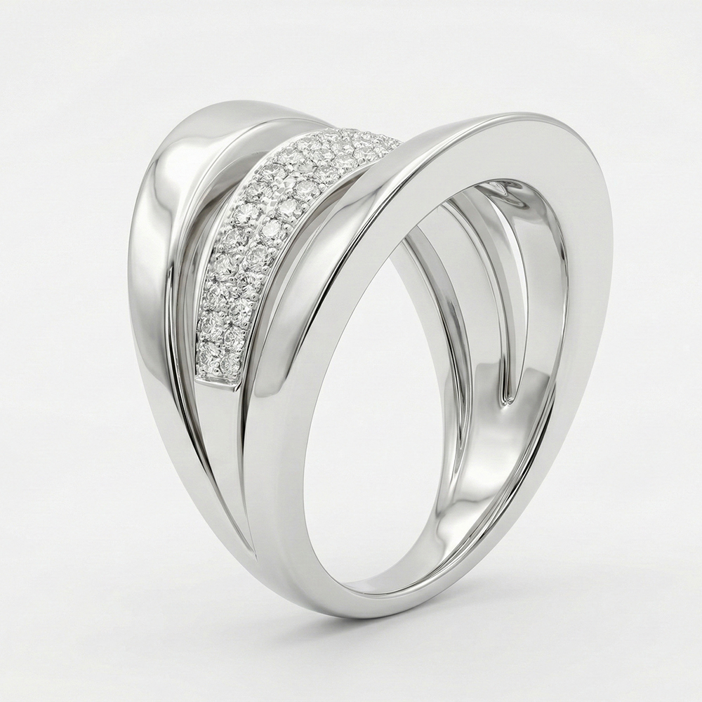 Anillo de diamantes en oro blanco con diseño moderno de líneas curvas y pavé de diamantes. Su estructura elegante y volumétrica destaca por un detalle central con diamantes que aporta brillo sofisticado y un estilo contemporáneo ideal para una joya exclusiva.