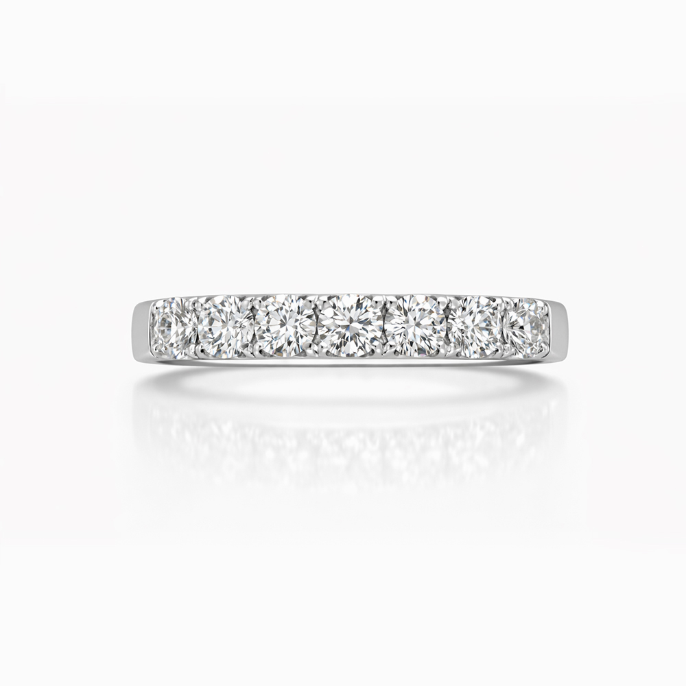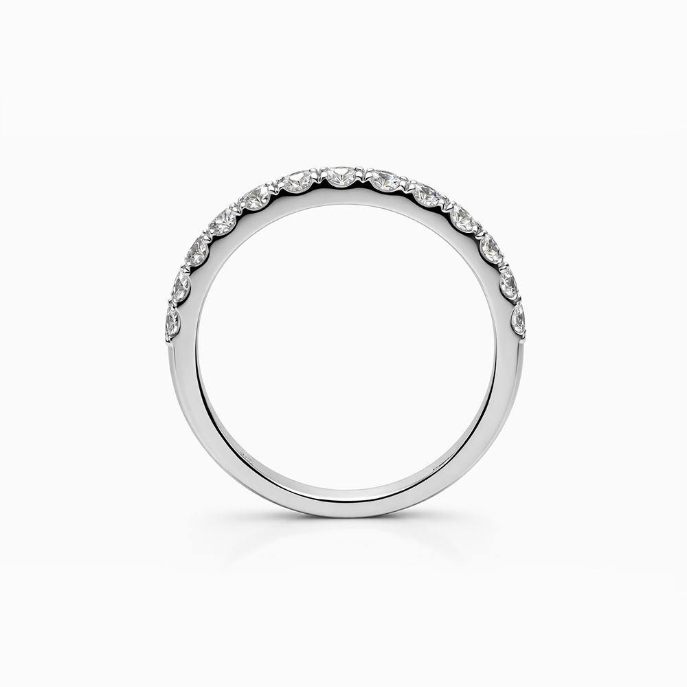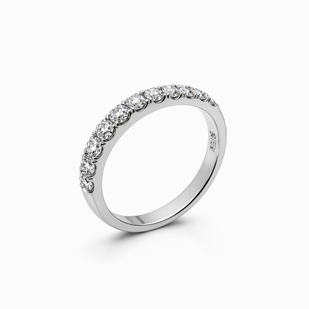 Anillo de diamantes en oro blanco estilo media alianza con una línea continua de diamantes engastados que maximizan el brillo y la entrada de luz. Diseño elegante, delicado y atemporal ideal como anillo de compromiso, anillo de aniversario o complemento de alta joyería.