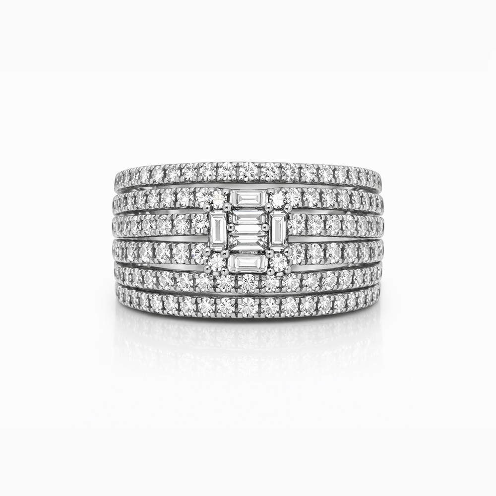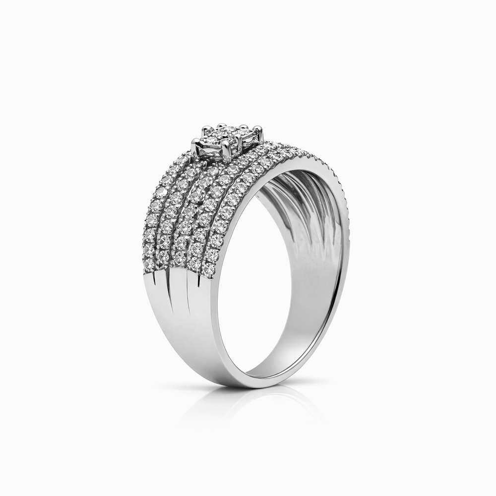 Anillo de diamantes en oro blanco con diseño de banda ancha y múltiples líneas de pavé de diamantes que aportan brillo intenso. En la parte superior destaca un diamante central estilo solitario elevado que realza la elegancia de la pieza. Una joya sofisticada ideal como anillo de compromiso o anillo de alta joyería.