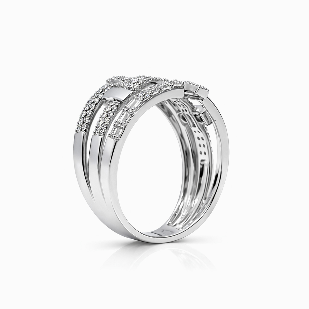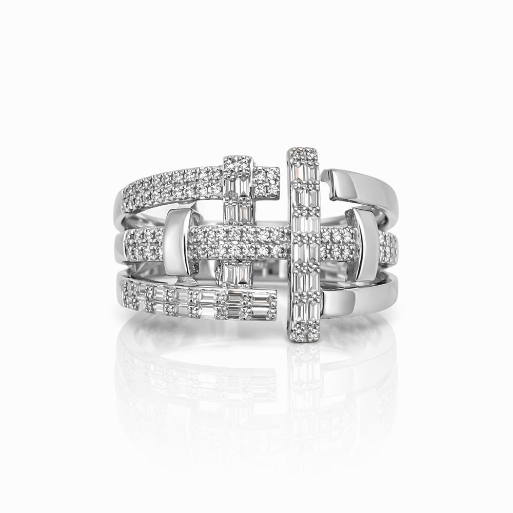 Anillo de oro blanco con diseño arquitectónico entrelazado compuesto por varias bandas decoradas con diamantes pavé y diamantes corte baguette. Su estructura abierta y moderna crea un efecto visual sofisticado con gran brillo, ideal como joya de alta gama.