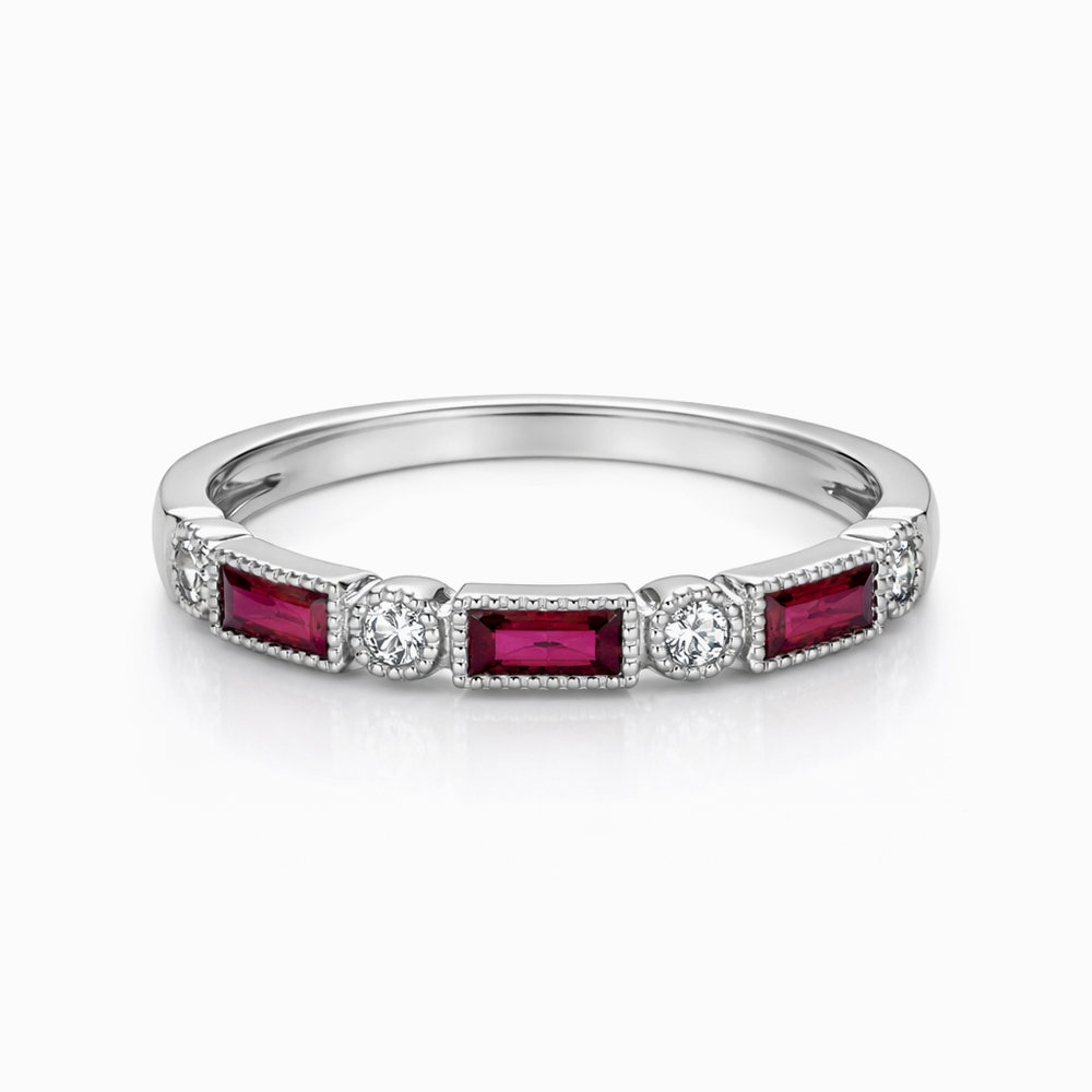 Anillo de oro blanco con rubíes de corte baguette engastados en línea, alternados con diamantes redondos que aportan brillo y contraste. Diseño elegante y delicado inspirado en la joyería clásica.