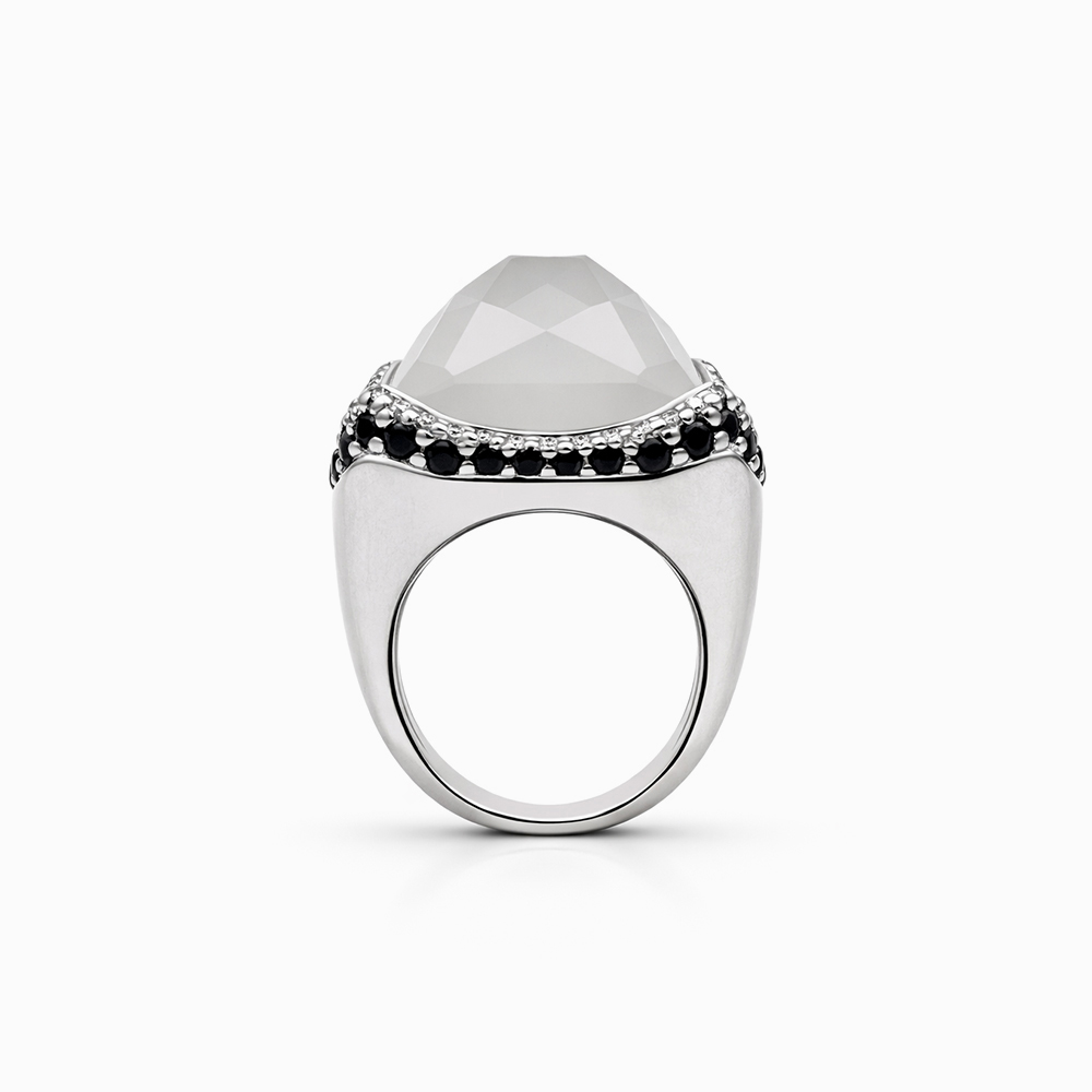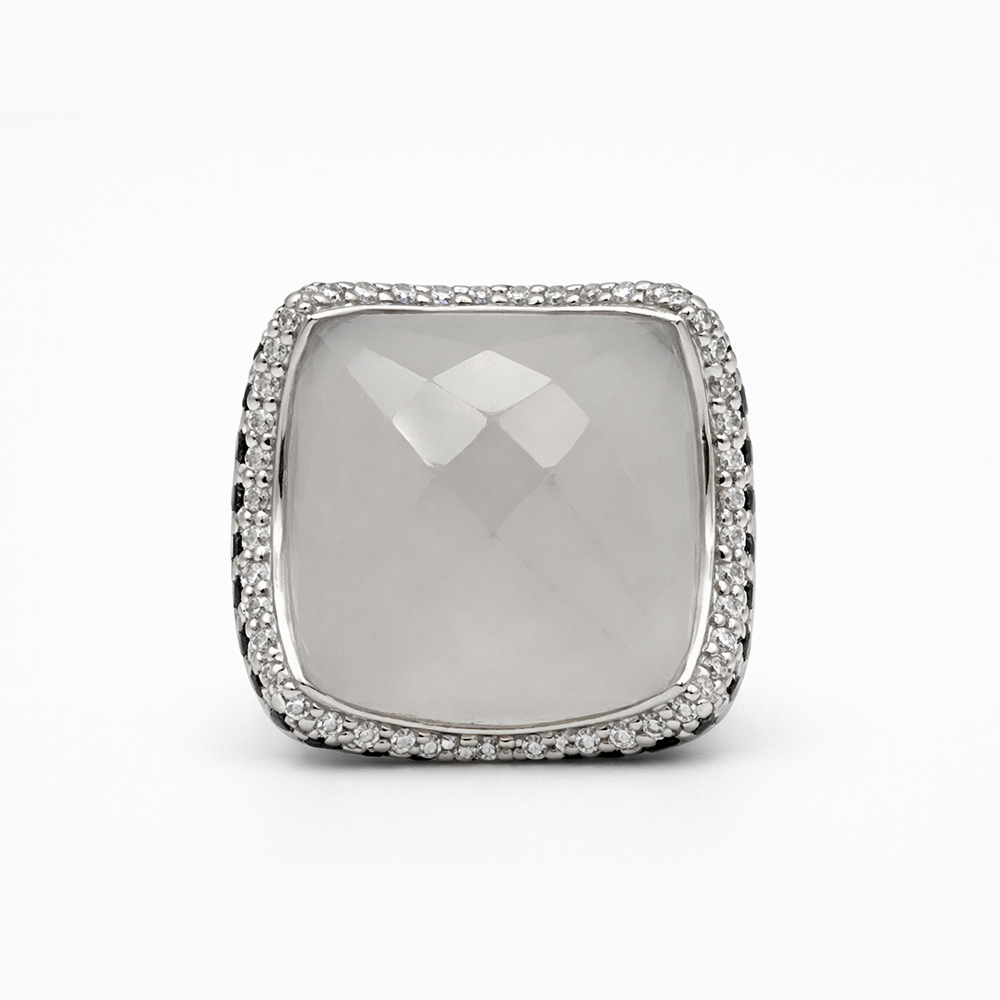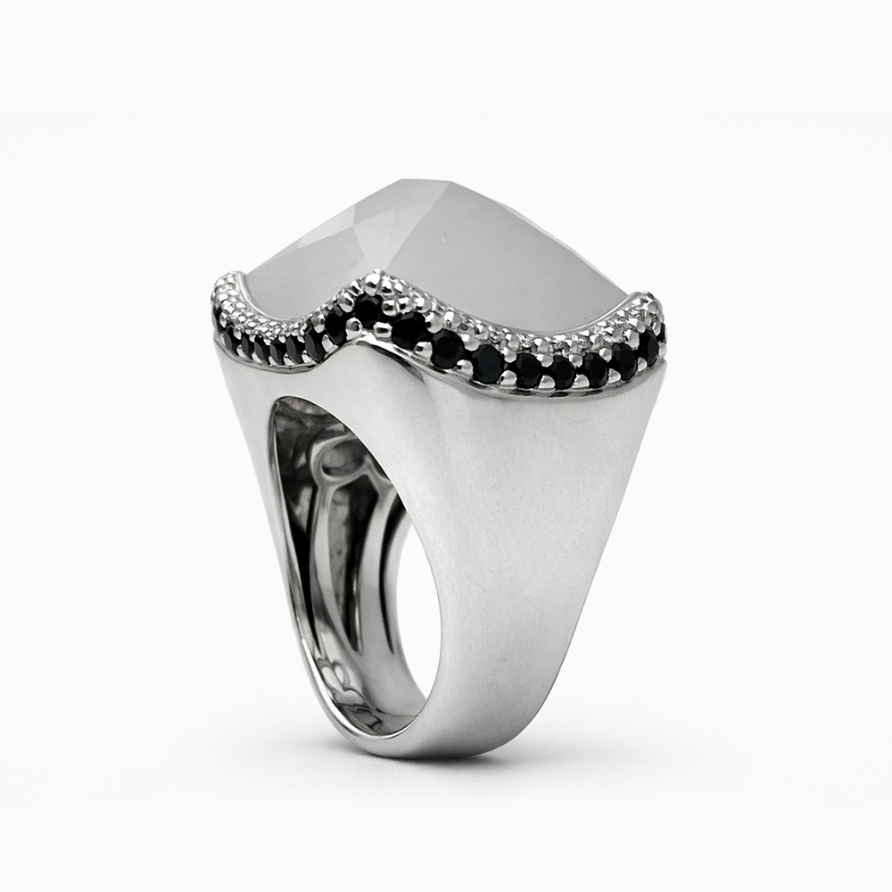 Anillo de diseño contemporáneo en oro blanco con gran piedra central facetada en tono blanco lechoso. El borde superior está decorado con diamantes negros y diamantes blancos que crean un contraste elegante y moderno, ideal para una pieza de joyería de alto diseño.