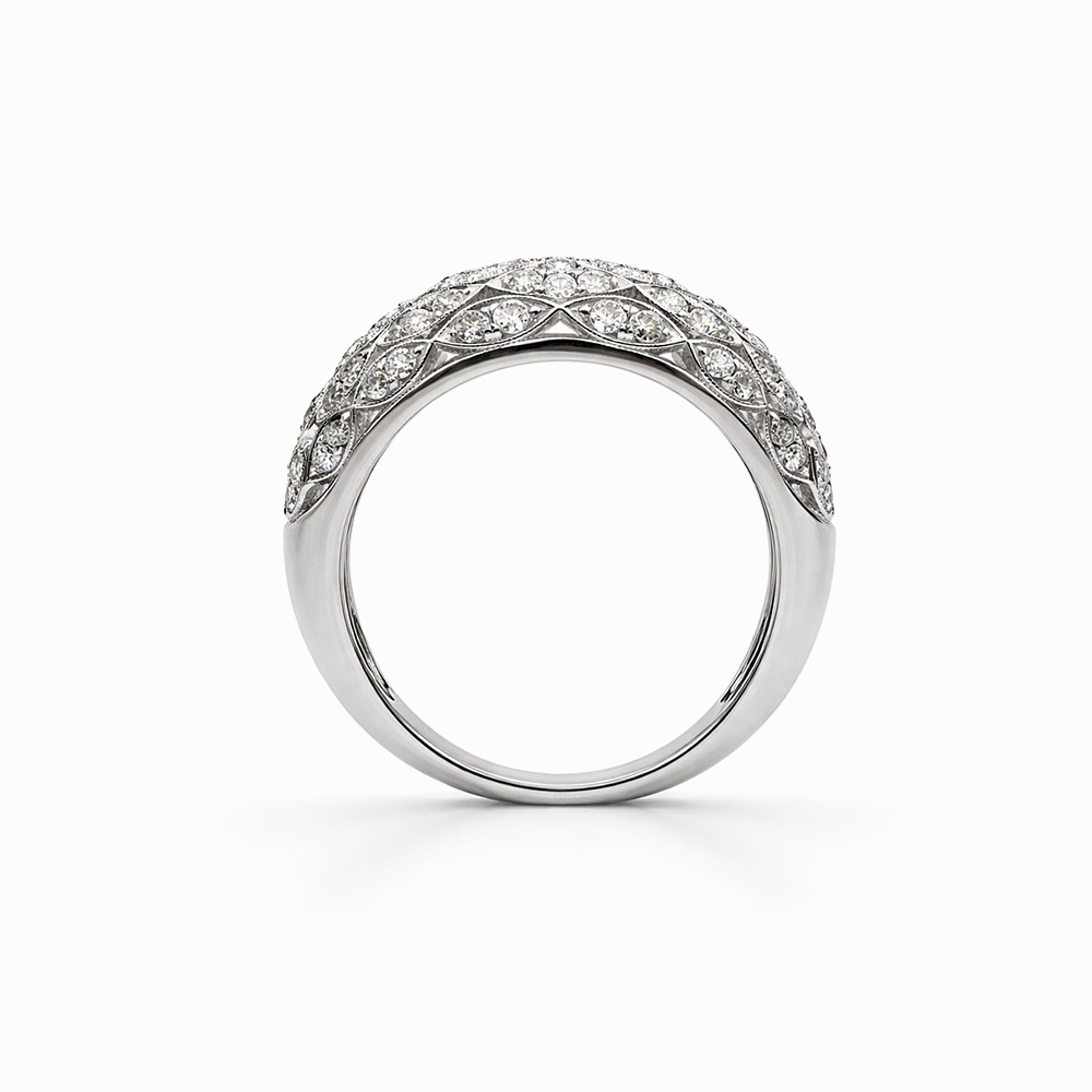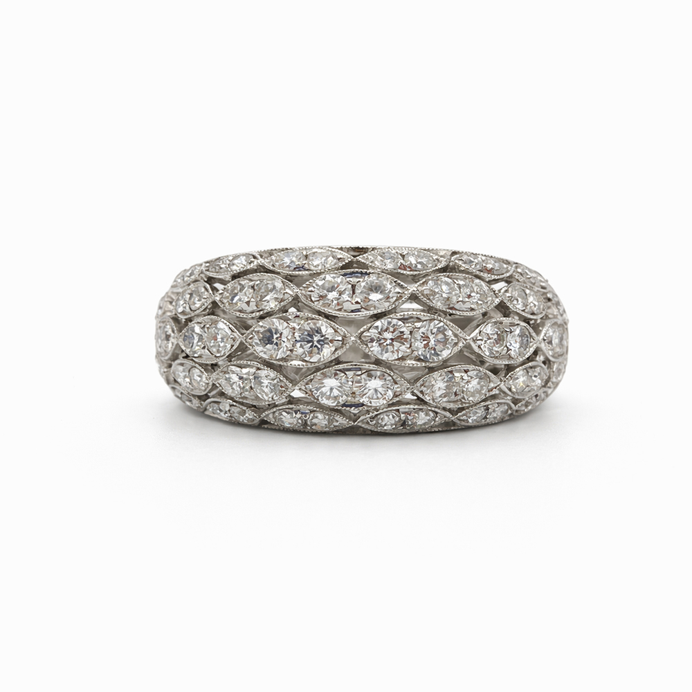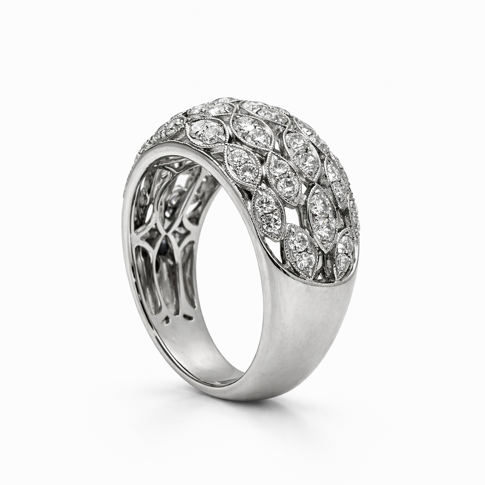 Anillo de oro blanco con múltiples diamantes engastados en diseño pavé estilo vintage. Pieza sofisticada con detalles calados y brillo intenso ideal para joyería de lujo.