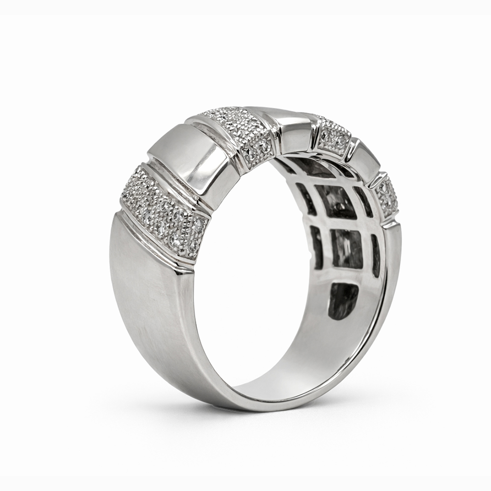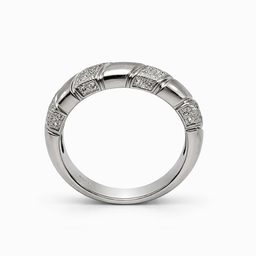 Anillo contemporáneo en oro blanco con diseño de banda segmentada y secciones con pavé de diamantes. La combinación de superficies pulidas y áreas con diamantes crea un contraste elegante y moderno, ideal para quienes buscan una joya sofisticada con carácter arquitectónico.