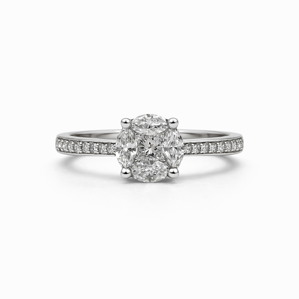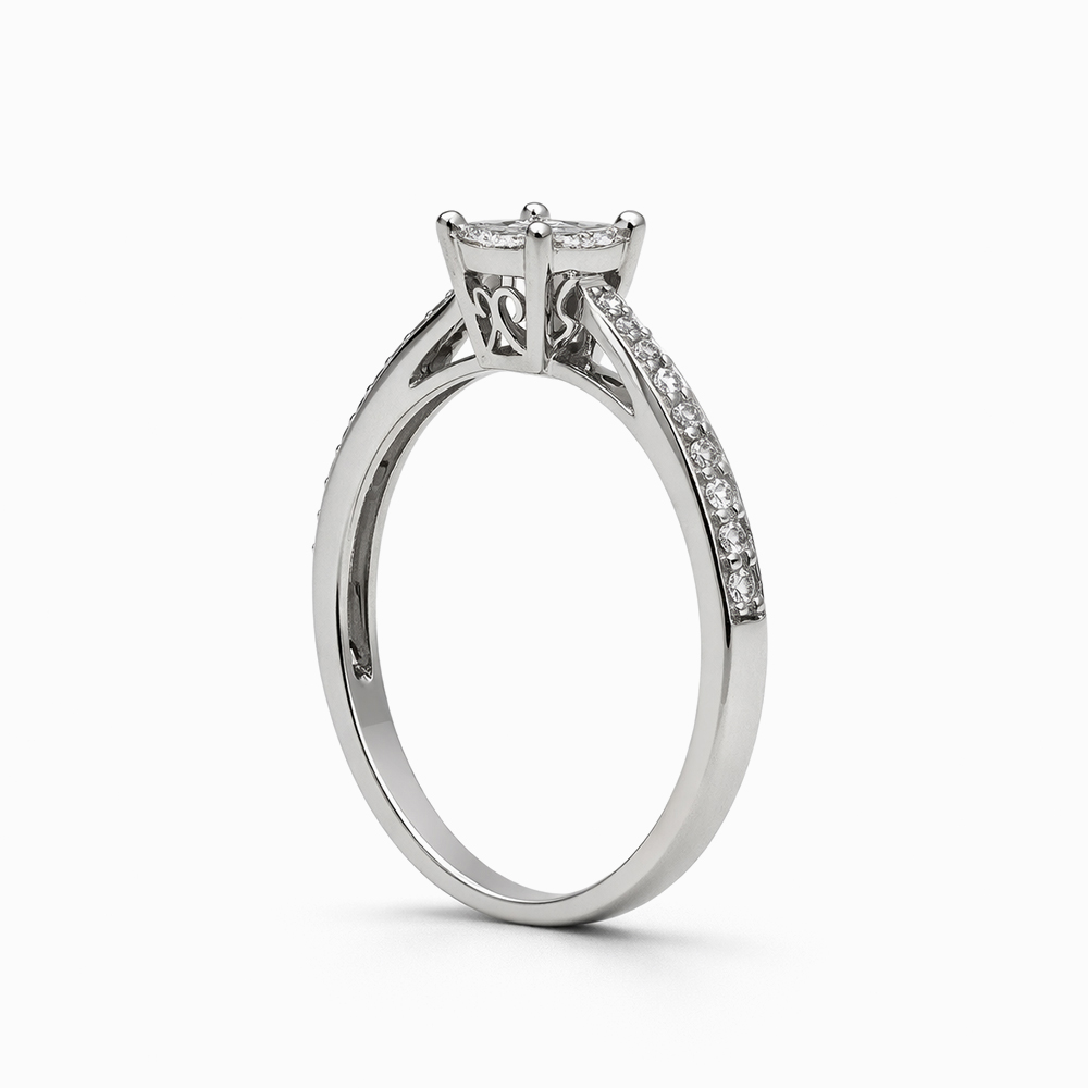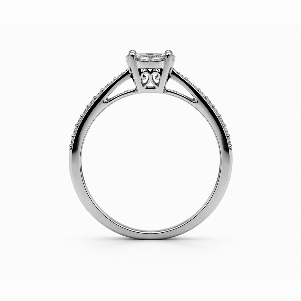 Anillo solitario elegante elaborado en oro blanco con una montura elevada que resalta la piedra central. La banda incorpora una fila de diamantes engastados a lo largo del aro, aportando brillo adicional y un estilo clásico ideal para compromisos o celebraciones especiales.