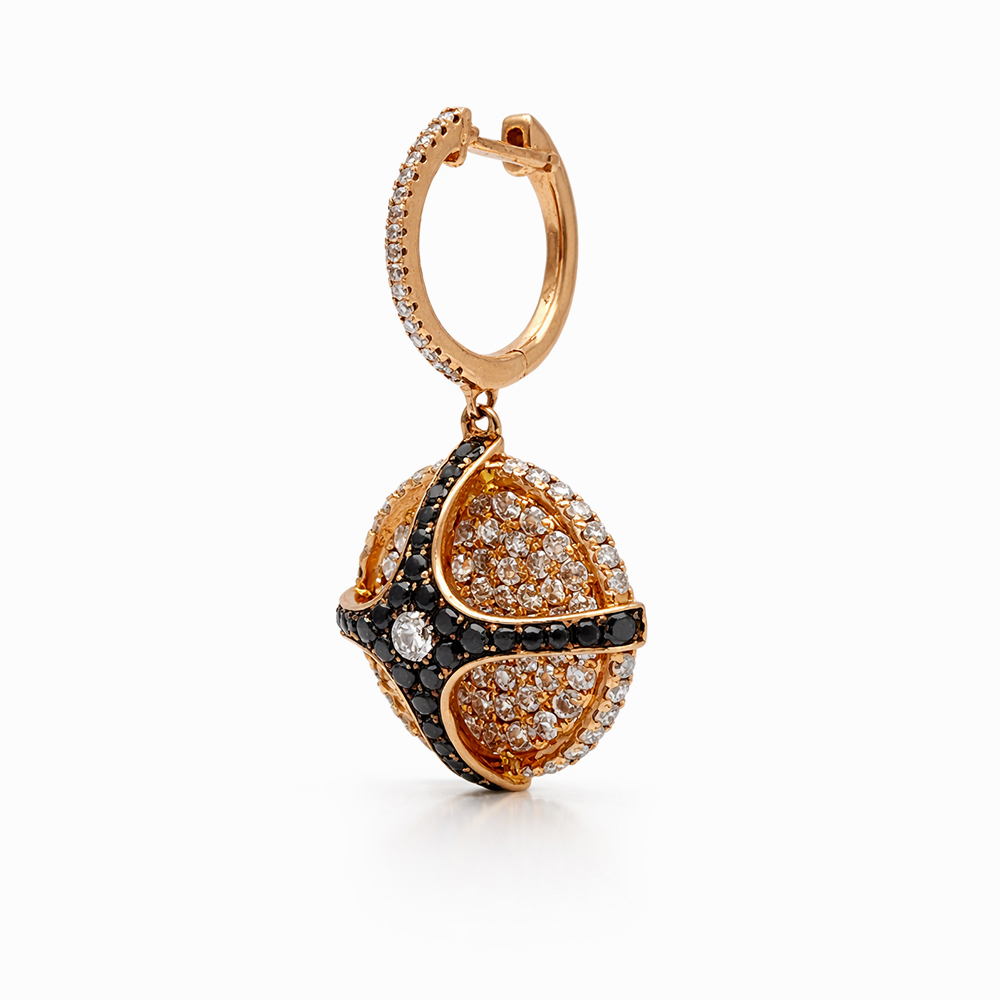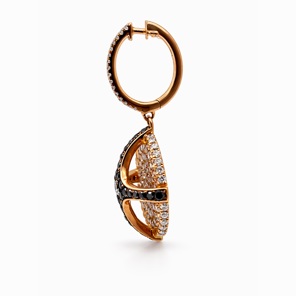 Aros colgantes de oro amarillo con diseño circular adornado con diamantes blancos y negros en patrón geométrico. Joyería sofisticada que combina contraste y brillo, ideal para ocasiones elegantes.