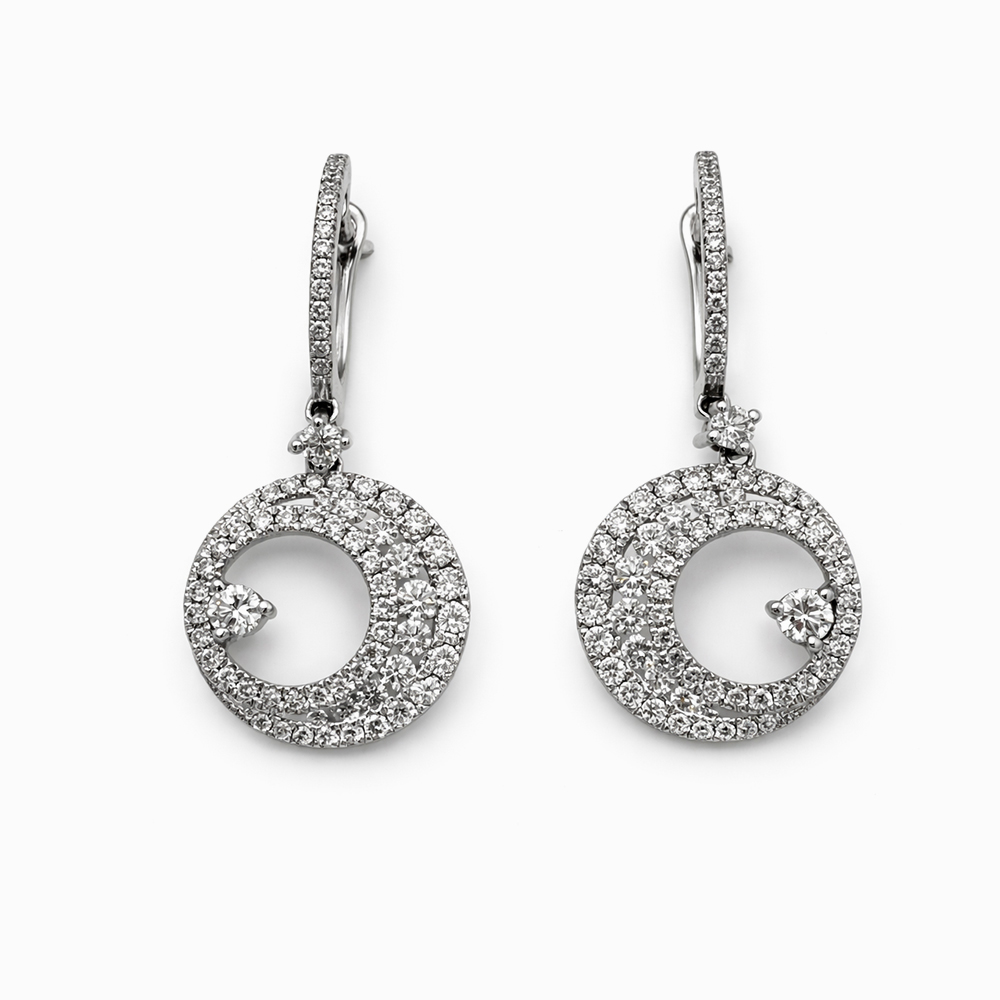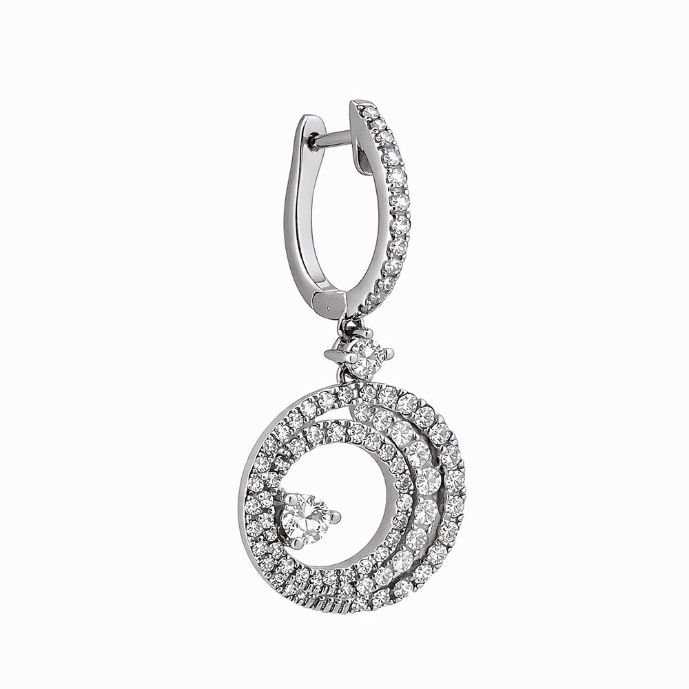 Aros de oro blanco con diseño circular adornado con diamantes. Joyería elegante ideal para ocasiones especiales o uso diario. Diseño moderno de aro colgante con diamantes que aporta brillo y sofisticación.
