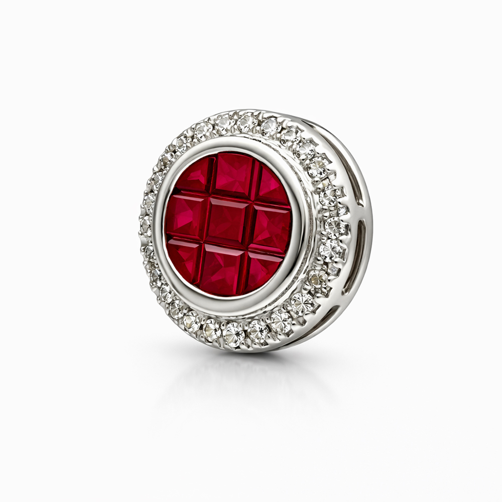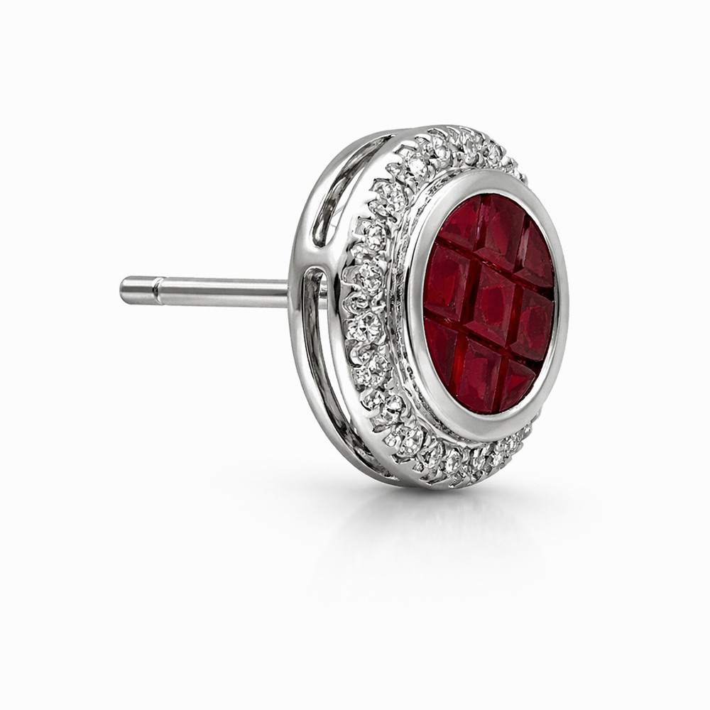 Aros de oro blanco con piedra central tipo rubí rojo en corte mosaico rodeada de diamantes brillantes. Diseño elegante y sofisticado ideal para ocasiones especiales, destacando por su contraste entre el rojo intenso del rubí y el brillo del oro blanco.