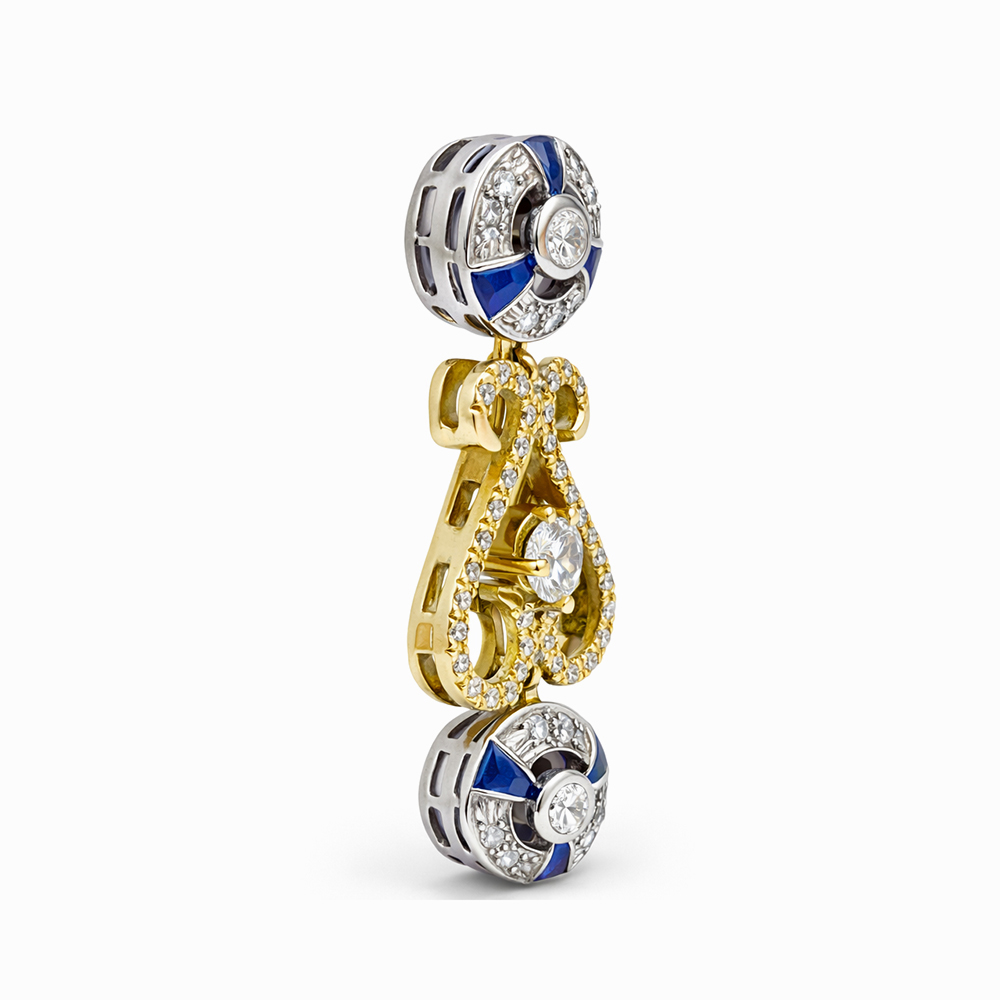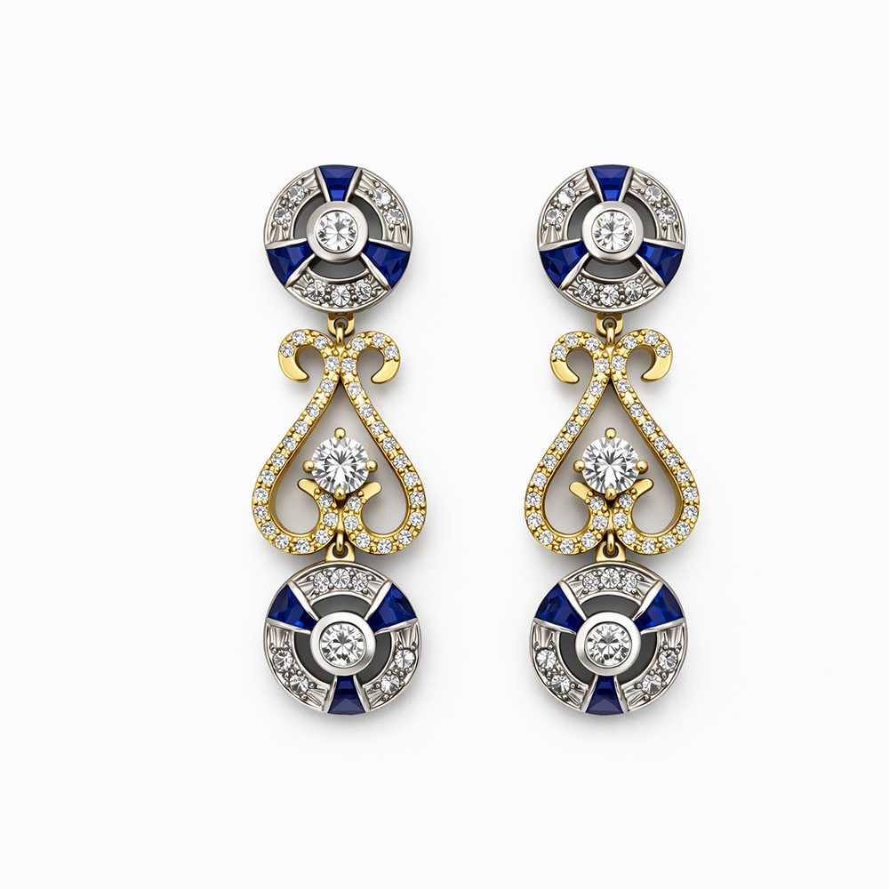 Aros de lujo elaborados en oro blanco y oro amarillo con incrustaciones de diamantes y zafiros azules. Diseño colgante estilo vintage con múltiples detalles brillantes que aportan elegancia, sofisticación y presencia para ocasiones especiales.