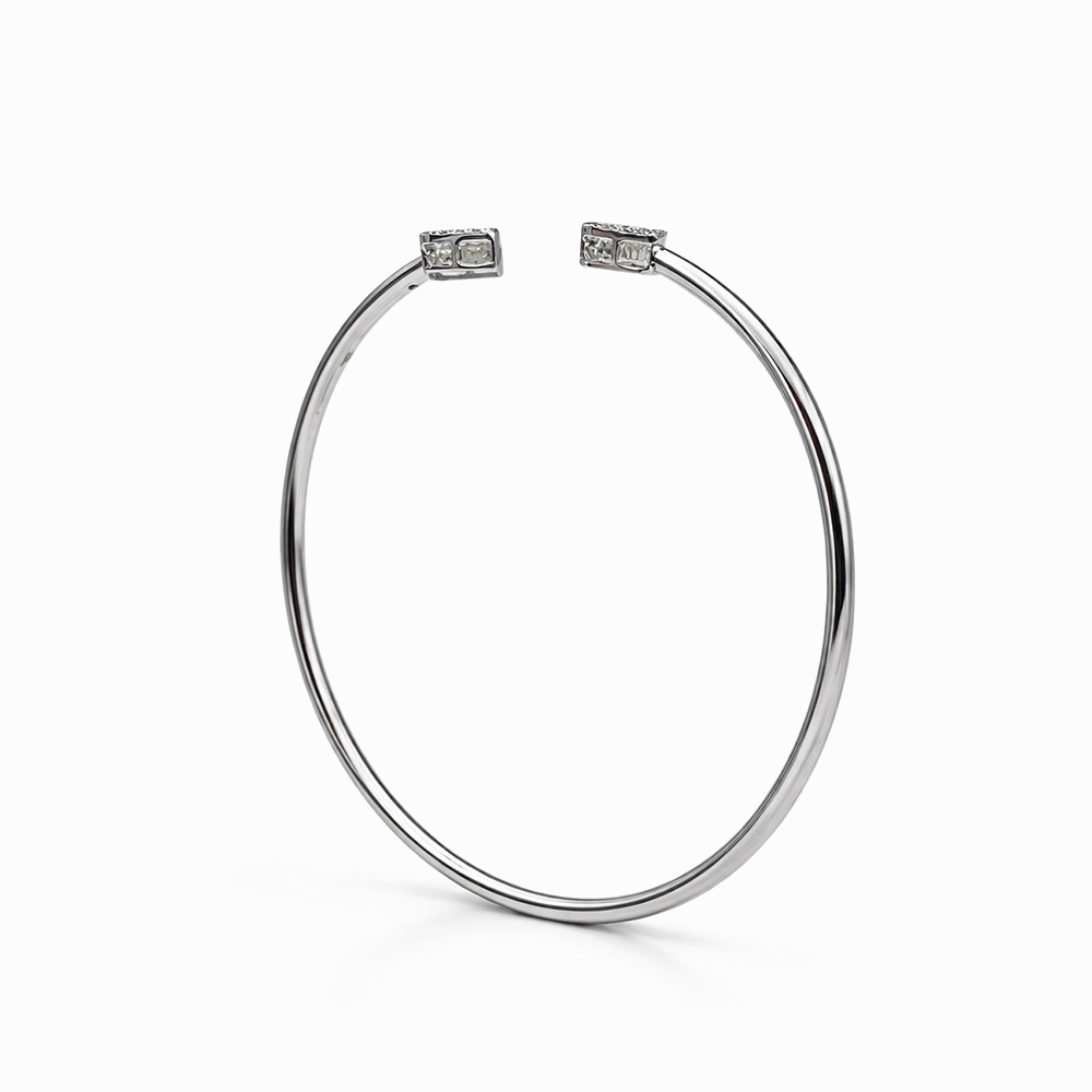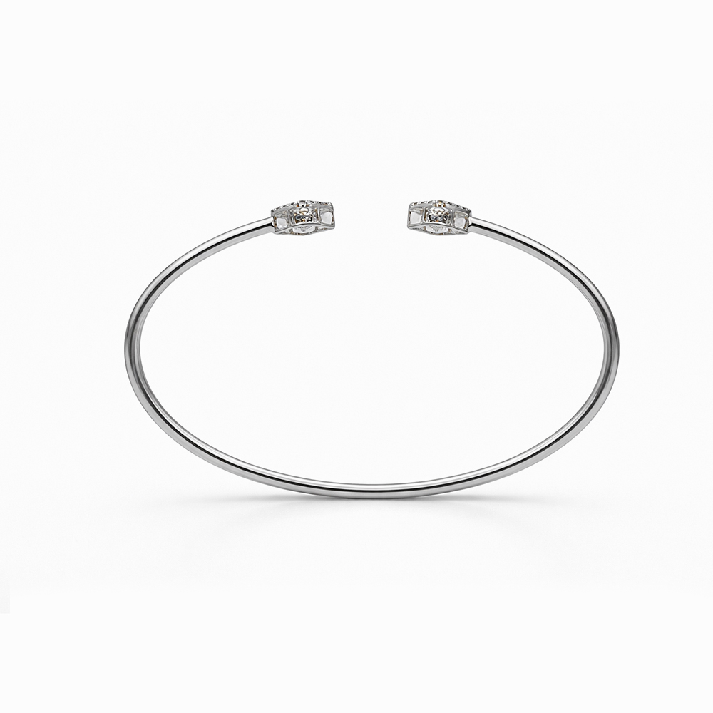 Pulsera rígida abierta de oro blanco con detalles geométricos cuadrados adornados con diamantes. Diseño minimalista y sofisticado ideal para joyería de lujo.