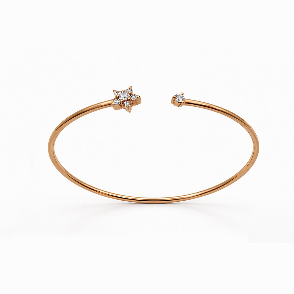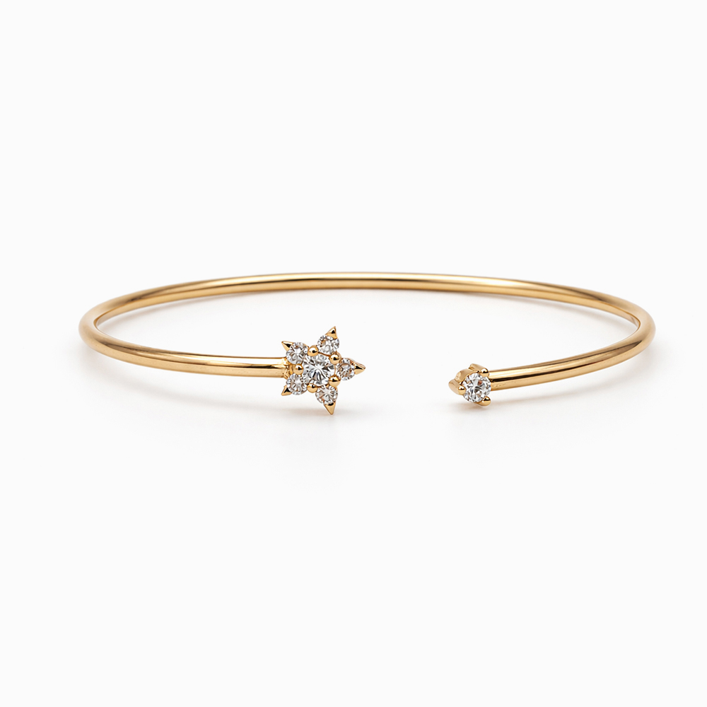 Pulsera rígida de oro con diseño abierto y detalle central de diamantes en forma de estrella. Estilo minimalista y elegante ideal para uso diario o ocasiones especiales.